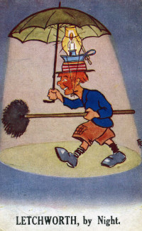 Humorous postcard of a man holding a chimney sweeping brush and an umbrella with an oil lamp tied to his hat.